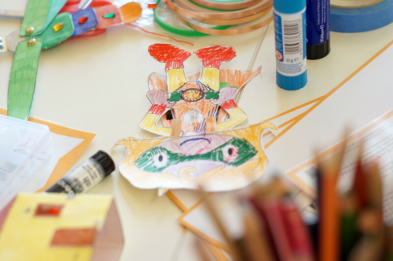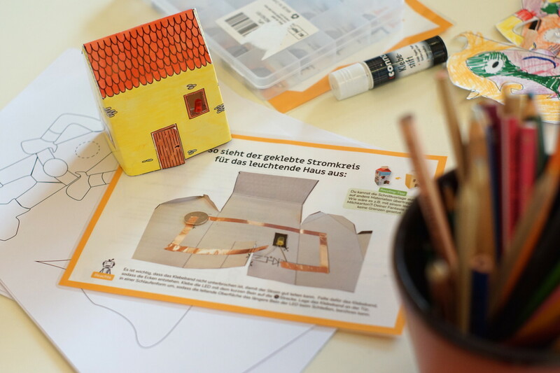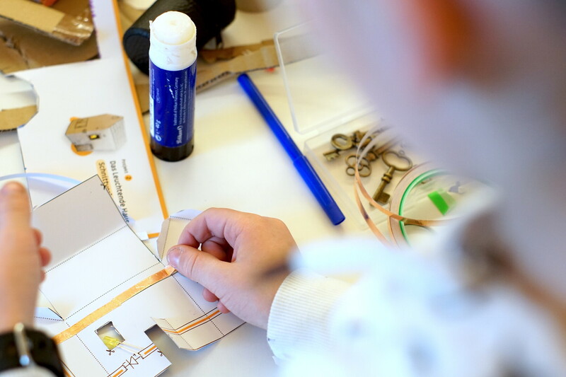 “Das ist ein Kurzschluss?” Emsiges Treiben in dem lichtdurchfluteten Makerspace in der Humboldt-Bibliothek Reinickendorf. “Strom ist faul. Er sucht sich Abkürzungen. Wenn er einen kürzeren Weg als durch die LED findet, leuchtet sie nicht.”, erklärt die Mentorin. Die Tische sind voll besetzt. Kinder und Eltern sortieren die Gegenstände, die sie für ihr Tüftelprojekt benötigen: Leuchtdiode, Batterie, Kupferklebeband. Mit der Bastelvorlage können sie Autos oder Häuser aus Papier zum Leuchten bringen. “Mein Auto soll aber überall leuchten!” - “Wenn die Verkabelung stimmt, klappt das sicher!”
