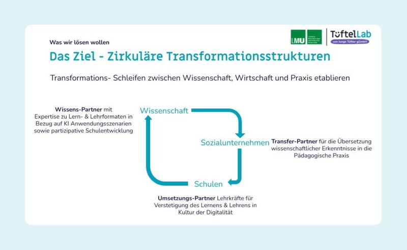 Neben den Projektpartnern der LMU und der Junge Tüftler gGmbH werden weitere Akteure und Akteur*innen in das Vorhaben eingebunden. Dazu gehört das Munich Center for Machine Learning, das mit der eigenen KI-Expertise sowie entsprechenden Netzwerken bei der Erstellung der Inhalte unterstützt. Die sich daraus ergebende fachliche Expertise wird durch Workshops und Austauschformate mit Lehrkräften und ihren Schülerinnen und Schülern ergänzt, um innovative Lehr- und Lernsettings gemeinschaftlich zu entwickeln. Erstellt werden Angebote auf unterschiedlichen Lernniveaus und für unterschiedliche Schularten, die co-kreativ erprobt, reflektiert und an die jeweiligen Bedarfe angepasst werden. Ziel ist die Erstellung eines hybriden Fort- und Weiterbildungsangebots zum Thema Lehren, Lernen und Prüfen mit, über und trotz KI für Lehrende und Schüler’innen und eine Elternakademie zur Schule im Zeitalter künstlicher Intelligenz.