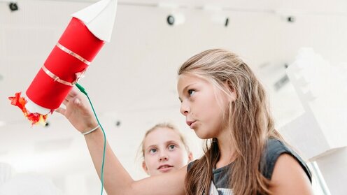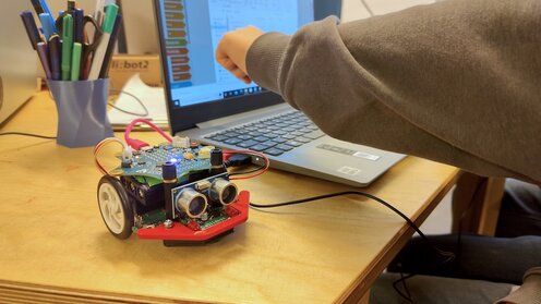 Max und Aylin grübeln über einem selbstgebauten Roboter. Noch will er nicht so recht funktionieren... Wo das Kabel wohl …