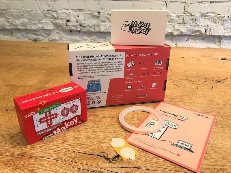 In der TüftelBox "Das Sprechende Poster" steckt ein Makey Makey - ein Mikrocontroller, mit dem sich viele verschiedene Projekte umsetzen lassen. Das Makey Makey ist eine Lernplatine, die ihr an euren Computer anschließen könnt.