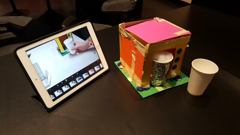 Nachdem die Prototypen fertig gebastelt sind, soll die Funktionsweise dargestellt werden. Die Schüler*innen bekommen eine kurze Einweisung in die App Stopmotion Studio, mit der sie am Tablet kleine Stopmotion-Filme im Handumdrehen selber machen können. Das Stopmotion basiert auf dem Prinzip des Daumenkinos. Dabei werden viele Einzelbilder hintereinandergeschnitten - kleine Veränderungen der Objekte werden dann beim schnellen Abspielen als Bewegung wahrgenommen (Hier geht es zur Anleitung für zu Hause). Schnell die letzten Handgriffe, die Musik und Soundeffekts im Video platzieren und fertig ist das Video für die große Präsentation. Im Gallery Walk werden die Tablets aufgestellt und jedes Team präsentiert ihren Prototypen.